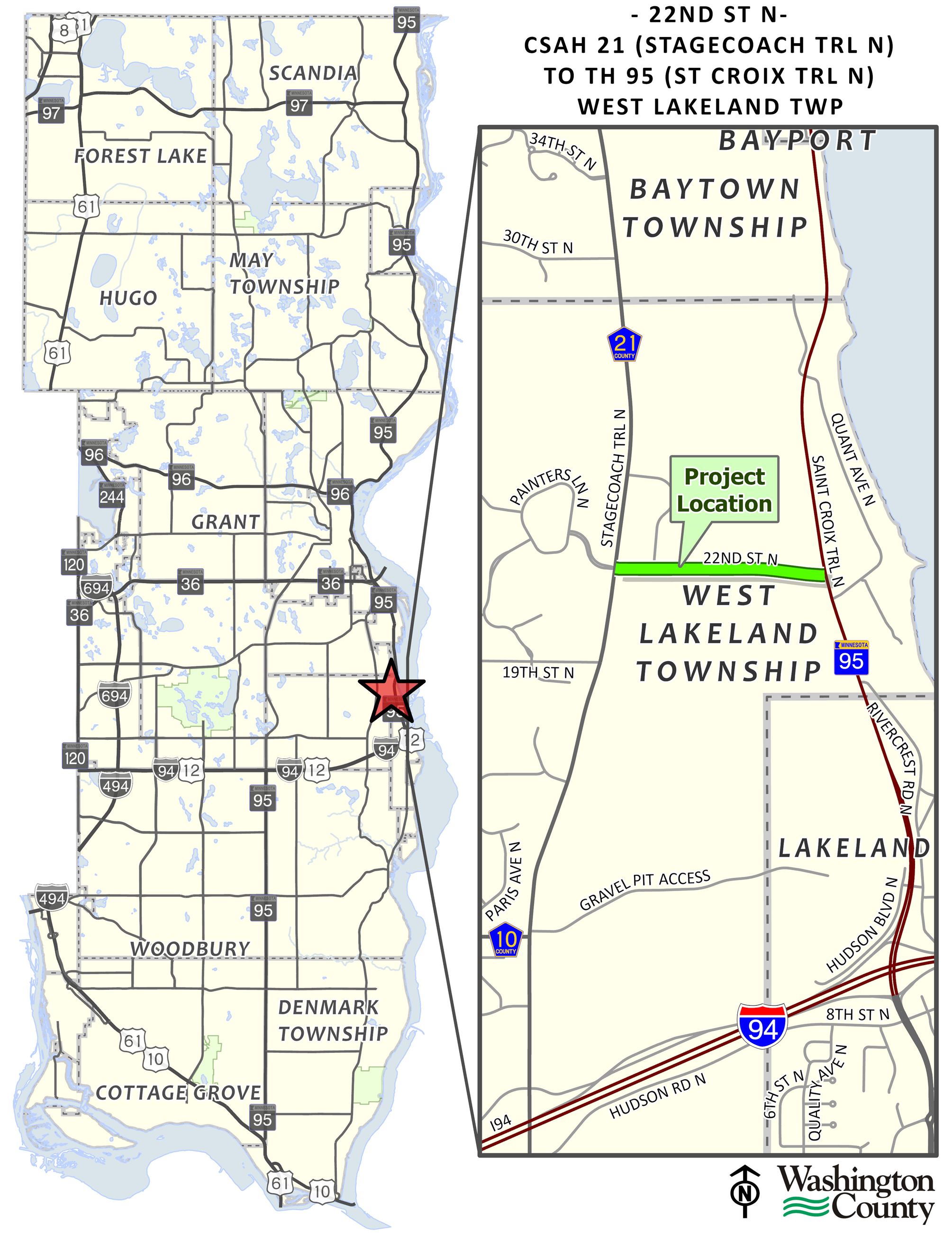 - 22nd Street N from County Highway 21 (Stagecoach Trail N) to State Highway 95 (St. Croix Trail N)