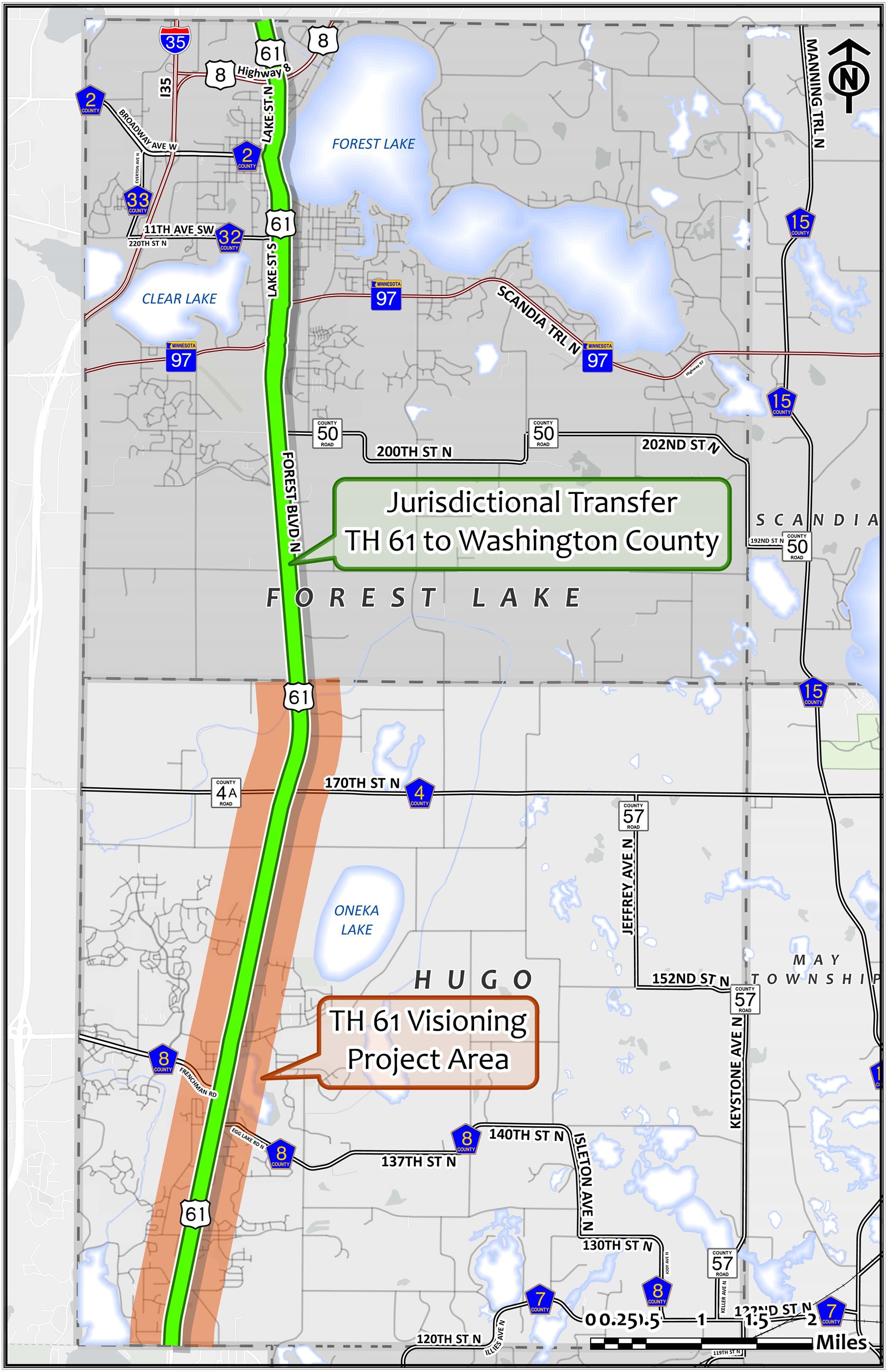 Washington County, MnDOT, and the City of Hugo are partnering on a corridor visioning study of Highway 61 through Hugo city limits. A traffic, land use, and engineering analysis along with community input will help identify the long-range vision for the corridor that will be used to define future improvements and guide a potential jurisdictional transfer of the roadway from MnDOT to Washington County.
